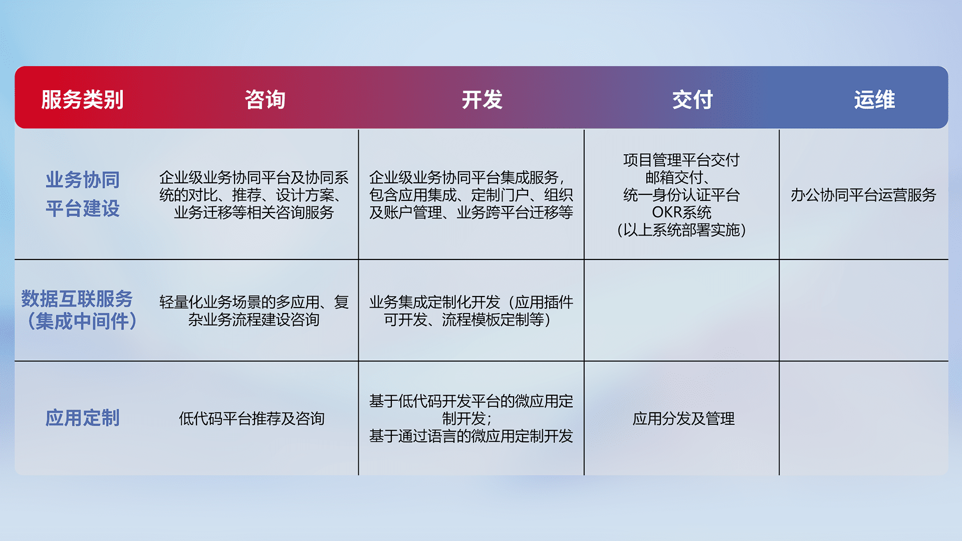 针对钉钉、、、企微、、IDaas等平台级产品提供产品的规划、、方案、、交付、、定制化开发等服务,,,,实现如统一协同办公、、智能客户服务、、混合会议管理、、智能数据查询、、、、等业务场景,,,实现数字化转型。。。。